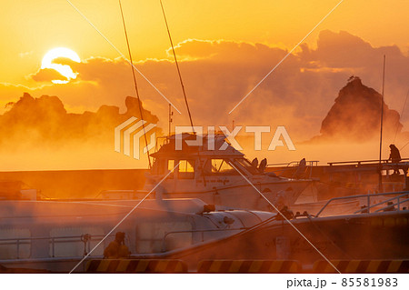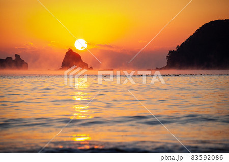 太平洋日向灘に昇る日出で黄昏色に染まった日南海岸の南郷町外ノ浦港に立ち昇る毛嵐