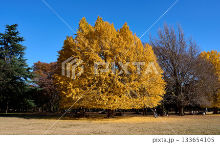 青空と冬の公園 広大な芝生と葉の落ちた樹木の風景