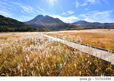 くじゅう長者原からの三俣山1745m タデ原湿原秋風景 タデ原湿原自然研究路 秋色のくじゅう連山