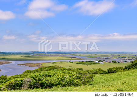 青空のもと、琵琶瀬展望台から望む霧多布湿原の風景