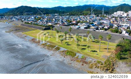 熊野の広大な砂利浜の七里御浜(三重県御浜町)をドローンで上空から撮影