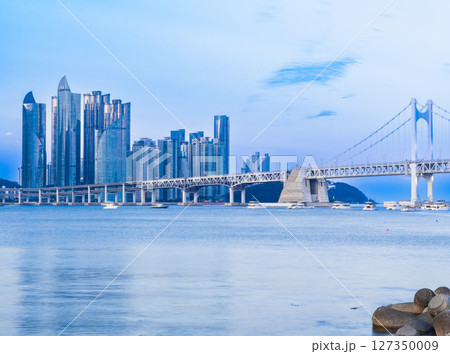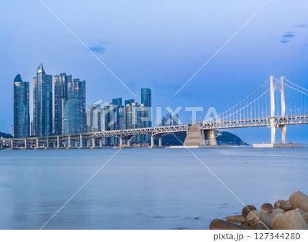 釜山 広安大橋とザ・ベイ101の高層ビル 夕景