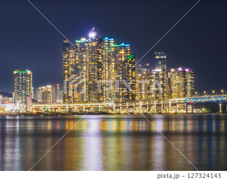 釜山 ライトアップされた広安大橋とザ・ベイ101の高層ビル