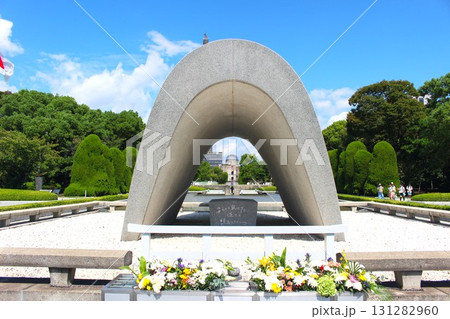 青空に映える広島の平和公園の慰霊碑と原爆ドーム