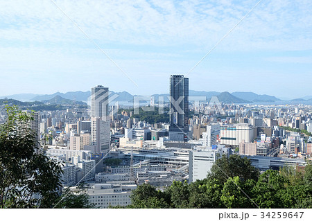 広島市街地の遠景風景です。中央に比治山公園、右にグランドタワー、駅前ビッグフロントビルが見えます。