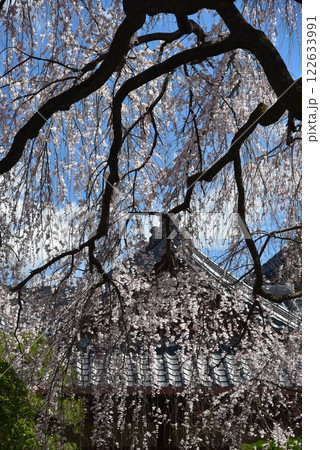 本満寺の春、西門と満開のソメイヨシノに春の柔らかい日差し