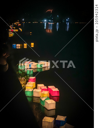 広沢池に浮かぶ京都アニメーション火災犠牲者追悼の灯籠
