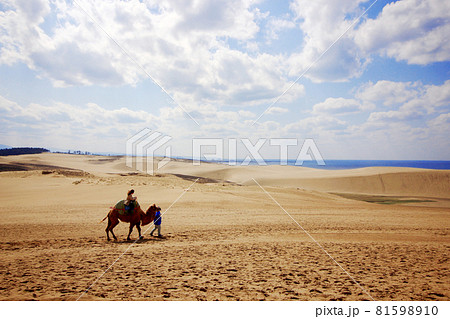 日本・鳥取砂丘とラクダに乗る女性のシルエット