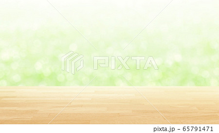 木目テーブルとボケのグリーンの背景 16:9