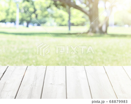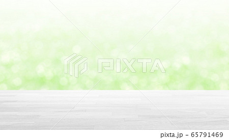 白木の木目テーブルとボケのグリーンの背景 16:9