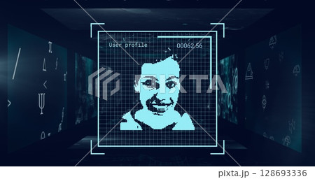 Projecting profile text, cyan face on central holographic display in dark lab, with wall panels