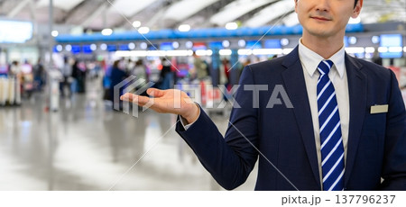 空港係員が案内ポーズ ■撮影協力:関西国際空港(KIX)