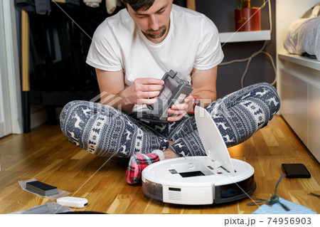 Young caucasian man doing cleaning for the holiday christmas in winter. A male in funny home clothes, pajamas with winter ornament collects and sets up a robot vacuum cleaner at home on the floor