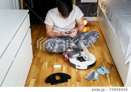 Caucasian young man in christmas pajamas doing vacuum cleaner robot maintenance. Male in winter patterned sleepwear and red socks slippers starts automatic vacuum cleaner. Robot vacuum cleaner repair