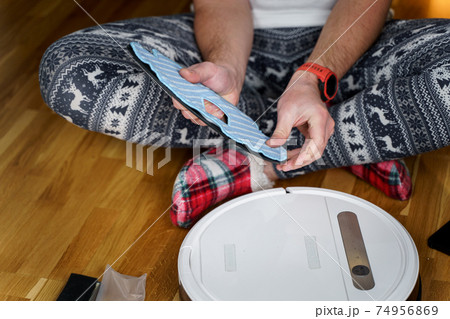 A young father in sleepwear with a winter ornament and Christmas funny socks serves a roobot vacuum cleaner for cleaning the house for the New Year and Christmas holidays. New tech for households