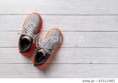 New laced up textile sneakers on the gray wooden floor. Copy space.