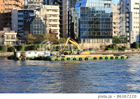 浚渫工事:川底の土砂をすく浚渫工事:川底の土砂をすくい取る浚渫船い取る作業台船