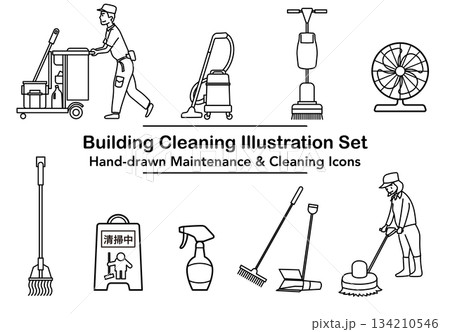 イラスト素材: ビル清掃員と清掃道具を描いた線画イラストセット