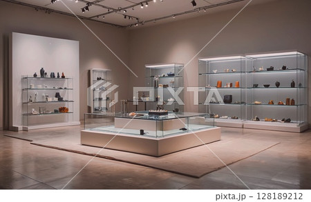Museum display of glass cases with various items inside. The display is well lit and the items are arranged in a way that is visually appealing. Scene is one of sophistication and elegance
