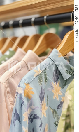 Colorful patterned shirts on wooden hangers in a fashion retail display, AI Generative