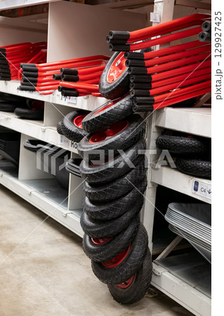 Individual examining multiple tires with red rims in a retail store during daytime hours