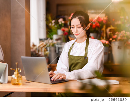 A modern florist shop interior showcases a variety of flowers and plants, with a laptop set on the counter. The business is well-organized and inviting.
