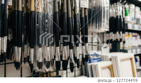 Close up of new art paintbrushes with black bristles hanging in an art supply store.