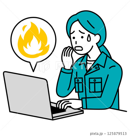 SNSが炎上して困惑している作業員の女性(ノートパソコン)