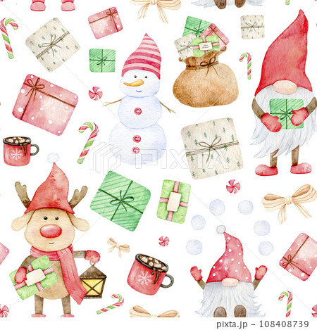 Christmas seamless pattern with Adorable Gnome, scandinavian elf, snowman, deer, giftbox, candy, New Year print. Watercolor hand drawn illustration for wrapping paper, textile, fabric