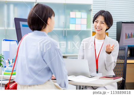 受付にいるスーツの女性に相談するイメージ