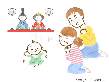 雛人形を飾って初節句を喜ぶ両親と赤ちゃんのイラスト
