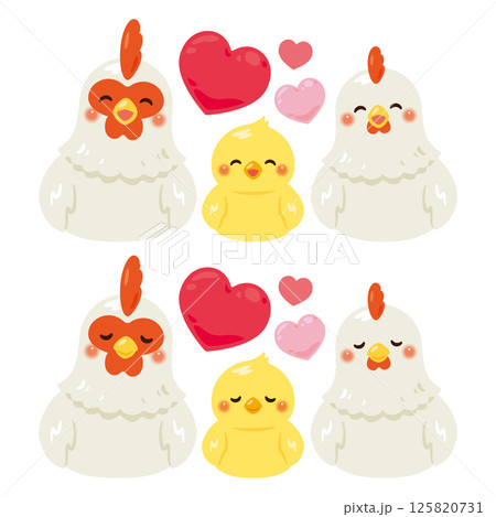 お座りした笑顔のニワトリの親子イラストセット