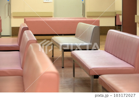 昼のホテルの広いロビーのたくさんの椅子の風景