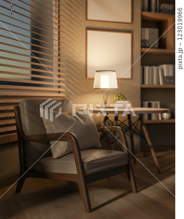 Contemporary interior with armchair, potted plant, wall wood panels and parquet floor. 3d render illustration mockup.