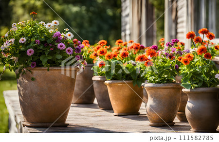 An array of terracotta flowerpots cradling an assortment of colorful flowers, captured with a shallow depth of field