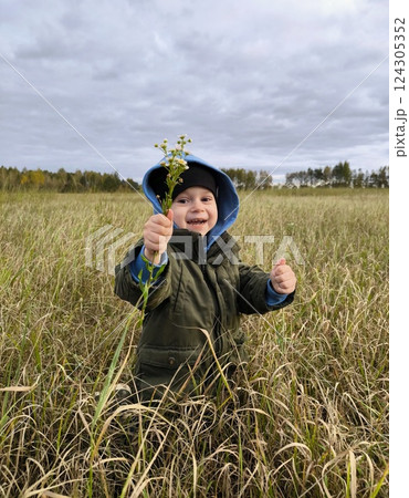 A happy child in a flower field. A child with a bouquet of flowers. A boy in a flower meadow with a bouquet of daisies. An outdoor nature park. A child with flowers in his hands