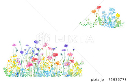 色々な花が咲き乱れる、春の野原の水彩イラスト。