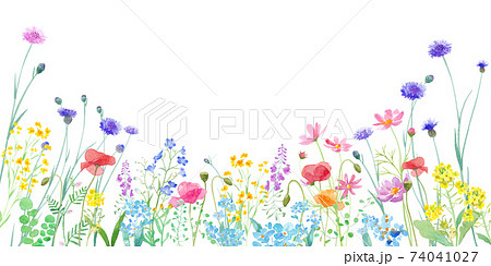 色々の花が咲き乱れる、春の野原の水彩イラスト。横方向シームレスパターン。