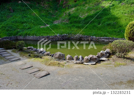旧広瀬邸。新座敷の庭先にきられた雨水マスの意匠。