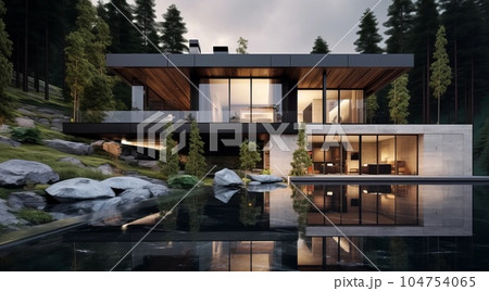 exterior of a luxury villa in a minimal style. Glass house in the mountains, photo AI