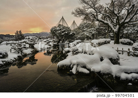 朝焼けの雪景色が美しい兼六園