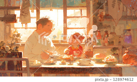 木漏れ日が美しく揺れる中で、家族がランチを楽しむ情景を水彩で描いた、やさしさあふれる風景イラスト