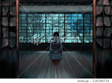 着物を着た白い女性の正座する幽霊と満月が映る床張りの障子のある日本家屋の廃墟