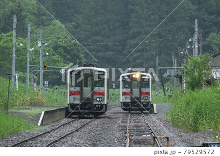 雨の峠下駅行き違い 列車交換 留萌本線 留萌線 廃止候補