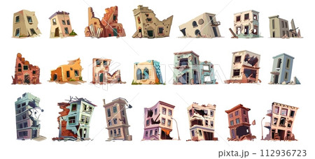 AI-generated content. Cartoon different houses ruins. Destroyed homes after earthquake bombing. Old abandoned buildings without residents. Time flow, vector elements
