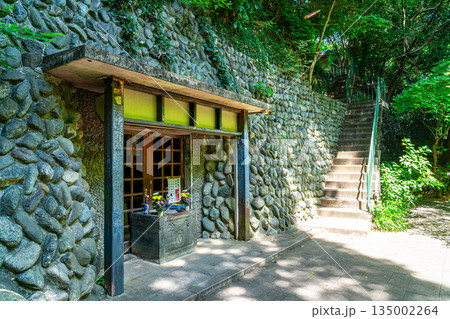 青空光芒を背景に藤の花が咲き乱れる季節に映える延命水・祈願スポット!「延命地蔵尊」天草市