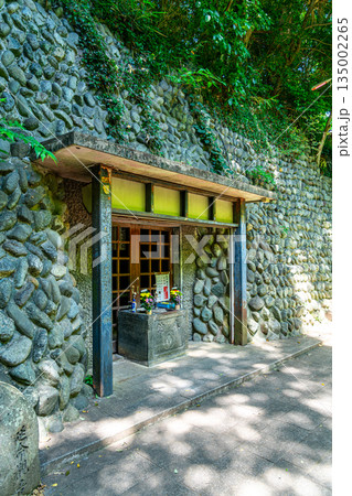 青空光芒を背景に藤の花が咲き乱れる季節に映える延命水・祈願スポット!「延命地蔵尊 周辺風景」天草市