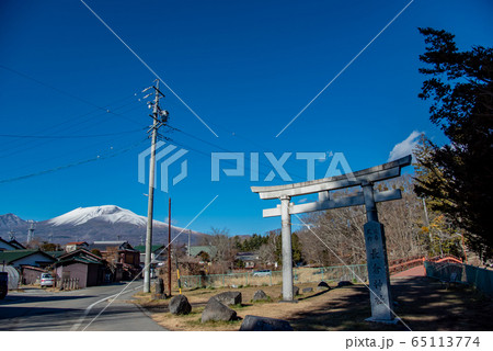 初冬の群馬県 浅間山と長倉神社 鳥居と社号標