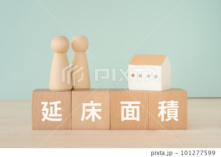 面積と書かれたブロック、電卓、家の模型、スマホ、ノート