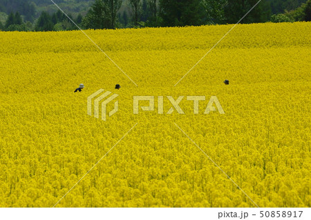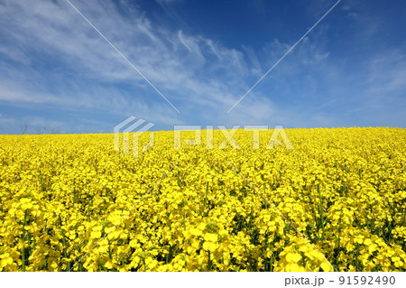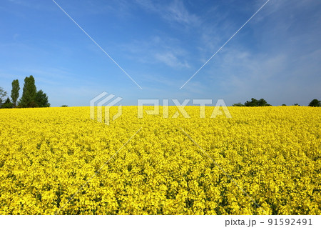 青森県西津軽郡鰺ヶ沢町建石町 岩木山麓の一面の菜の花畑と青空と雲